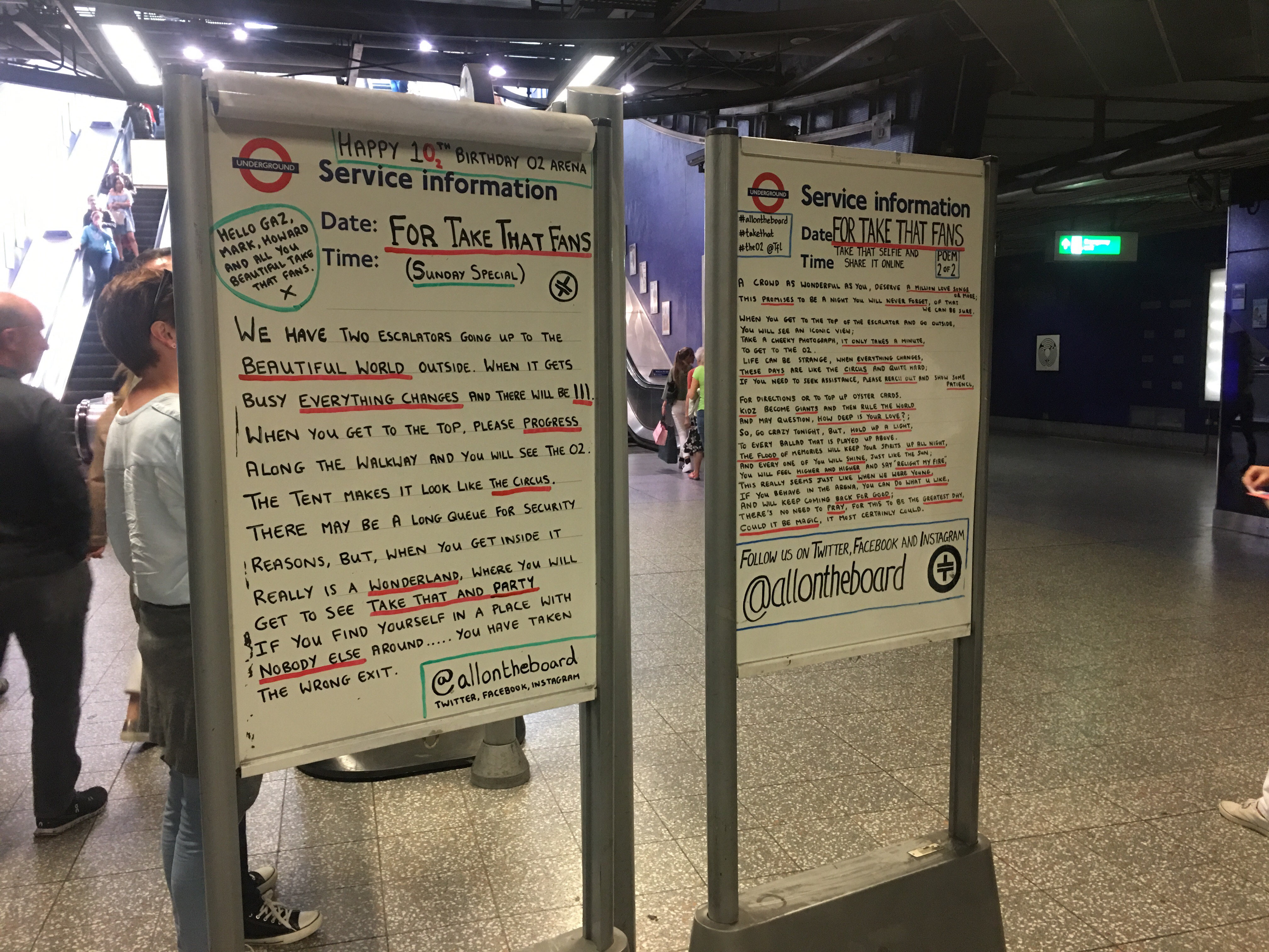 At North Greenwich tube station, there were the signs done by allontheboard, using Take That songs to make puns. I love these signs!